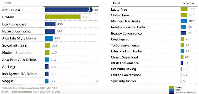 Výběr zboží ovlivňuje i rostoucí zájem spotřebitelů o jejich vzhled. Dnes se o něj zajímá 64,3 %, zatímco v roce 2013 to bylo pouze 61,9 %. Zdravý životní styl se promítá do rostoucích kategorií potravin, nápojů, kosmetiky i drogerie pro domácnost – za posledních pět let došlo k nejvýraznějšímu nárůstu u produktů s obsahem aktivního uhlí (+338,6 %), proteinové výrobky (+137,5 %) a ekologická drogerie (+40,6 %). Nejotevřenější skupinou k inovacím jsou přitom mladí nezadaní lidé, bezdětné páry či rodiny s malými dětmi.