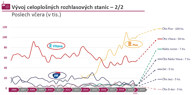 Díky tomu se tak podíl stanic Českého rozhlasu zvýšil na 27,1 %, což je o tři procentní body víc než v posledním měření za období druhého pololetí 2020. Pandemie covid-19 měla podle výzkumníků posílit především zpravodajské stanice a stanice, které jsou obsahově specificky profilované, a to i mezi komerčními stanicemi (např. Country rádio, Rock Rádio).