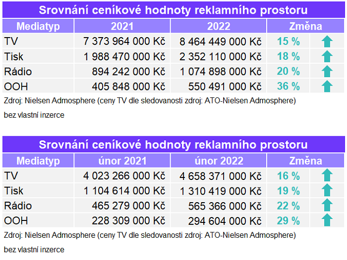 Monitoring reklamních investic Nielsen Admosphere eviduje za první dva letošní měsíce meziroční nárůst hrubých investic za nákup reklamního prostoru ve výši téměř 17 %. Nárůst se týká všech monitorovaných mediatypů – nejvíce ve venkovní reklamě, rádiu a v tisku. Dvouciferné nárůsty si ale připsala i televizní reklama.