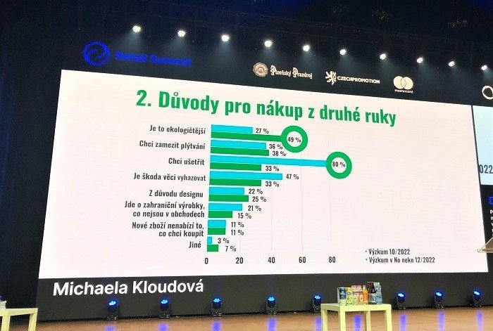 Řada příspěvků se také dotýkala m. Češi podle Michaely Kloudové jsou připraveni na nákup cirkulárních projektů, především tedy mladých lidí z generace Z (lidé do 24 let). Značka No neke, která loni na začátku prosince otevřela v pilotu první cirkulární obchod v Česku v prostorách Westfield Chodov, má za čtyři měsíce provozu dobré zkušenosti a zjistila, že většina Čechů (76 %) po návštěvě prodejny změnila názor na nákup zboží z druhé ruky. Hlavním důvodem, proč zákazníci takové zboží kupují, je podle výzkumu No neke to, že jde o ekologičtější výrobky. Jejich výhodnější cena je uváděna až jako druhý důvod. To, zda No neke přejde do trvalého prodeje, se v tuto chvíli řeší. Značku oslovili i provozovatelé dalších obchodních center a jedná se o tom, zda a kde by se dlouhodobá prodejna No neke otevřela. Jedná se přitom i s OC Westfield Chodov.