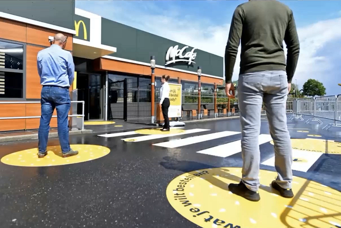 Třeba McDonald ‘s v Nizozemí vytvořil na zemi speciální značky, aby zákazníci čekali před restaurací v rozestupech. Burger King zase rozdával obří sombrera, díky kterým mohli lidé jíst a také si zachovávali rozestupy. Coca-Cola přišla s možností výdeje nápojů bez nutnosti čehokoli se dotknout, kdy si lidé vybrali produkt jen zrakem.