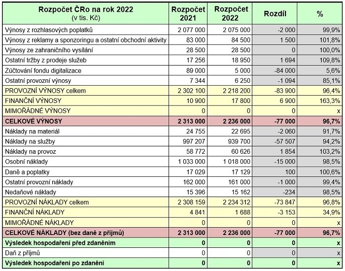Rozpočet Českého rozhlasu (ČRo) na rok 2022 je sestaven jako vyrovnaný se shodným objemem nákladů a výnosů ve výši 2,236 mld. korun. Proti rozpočtu na rok 2021 se rozpočtová suma snižuje o 77 milionů korun. Český rozhlas v novém rozpočtu počítá se snížením počtu pracovních míst k 31.3. 2022. Zdůvodňuje to stagnací koncesionářského poplatku, který se od roku 2005 nemění a představuje 45 Kč.