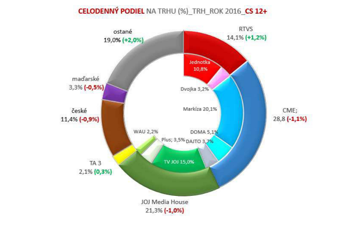 Televizní stanice RTVS v současnosti operují se dvěma kanály – Jednotka a Dvojka. Jejich souhrnný podíl na sledovanosti představoval v roce 2016 více než 14 % v divácké skupině starší 12 let. Jde o třetí nejsilnější televizní skupinu na slovenském televizním trhu.