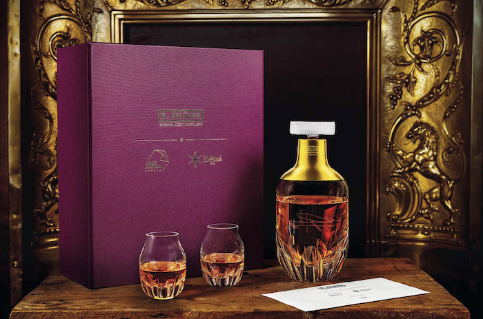 „Limitovaná edice ručně foukané karafy a skleniček se tvarově inspiruje svojí vlastní podstatou základního produktu – slívy. To je to nejcennější, co dodává edici výraz, chuť a vlastní eleganci. Tvar švestky ve formě hlubokých broušených oliv zdobí láhev i sklenice, čímž jim dodává optiku a hloubku, která následně odráží zlatavou barvu a sílu slivovice, celý její příběh,“ popisuje Lukáš Jabůrek, jenž byl dříve uměleckým ředitelem sklárny Moser a nyní vede vlastní studio v Jirkově nedaleko Chomutova.
