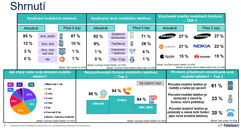 Značky Samsung a Xiaomi/Redmi jsou v současnosti nejvyužívanějšími značkami mobilních telefonů u českých uživatelů. K jejich používání se shodně přihlásilo 27 % z nich. Na třetím místě je s 15 % Apple, na čtvrtém Huawei s 11 % a na pátém Nokia s 8 %. Žádná jiná značka nepřekročila hranici 5 %. Vyplývá to z výzkumu Nielsen Admosphere pro MediaGuru.cz.
