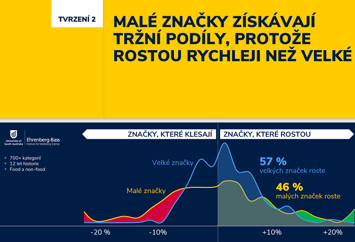 Upozornil také na univerzitní výzkum The Ehrenberg-Bass Institute for Marketing Science (EBI), který probíhal 12 let na 700 kategoriích potravinových i nepotravinových výrobků (food i nonfood). Sledoval, jak velké a malé značky rostou z roku na rok. Ve skutečnosti 90 % růstu malých značek (míněno značky s penetrací pod 5 %) se pohybovalo v rozmezí -18 % až +18 %. U velkých značek se pak 90 % růstu odehrává mezi +8 % a –8 %. Je ale důležité dodat, že jen 46 % malých značek meziročně roste, kdežto u velkých značek je to 57 %. „Když jste malí, máte vyšší šanci, že budete ztrácet podíl na trhu,“ dodává Sarvaš a pokračuje: „Ano jsou tu malé značky schopné generovat růst +15 %, + 20 %, ale hodně jich odchází na hřbitov malých značek, který nenavštěvujeme a nechceme ho vidět.”
