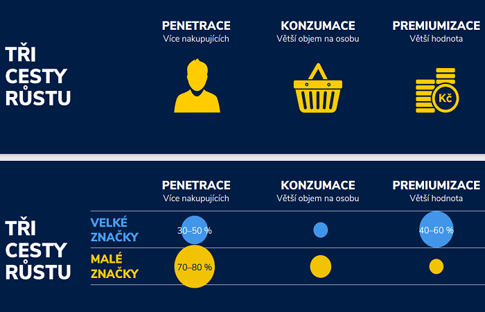 Proč věříme mýtům o malých značkách? Vidíme na trhu, jen ty malé, které uspěly a mají vysoká čísla, která jsou přesvědčivá. Navíc většina analýz malých značek údajně probíhá v horizontu pouhých tří nebo čtyř let jejich existence, což je relativně krátká doba. Ale malé značky mohou růst, a v tomto případě existují podle Štefana Sarvaše tři cesty – vyšší penetrace, zvýšená konzumace a premiumizace, kdy se prodává za vyšší ceny. Potom je možné dosáhnout zvýšeného růstu. „Chcete-li přežit, staňte se velkým,“ radí Štefan Sarvaš.