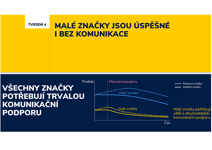 Co se stane, když značka vypne komunikaci? Velká začne klesat až po roce nebo dvou, ale dokáže ještě trochu růst. Ovšem malé značky, když vypnou komunikaci a podporu, tak začnou klesat okamžitě. Má se to týkat i těch, které předtím rostly. Malé značky tedy rozhodně nejsou úspěšné bez komunikace. Malé značky navíc téměř skoro nemají „heavy buyers“ (zákazníci s vysokou intenzitou nákupu). I zde platí, že čím větší značka, tím více „heavy buyers“.