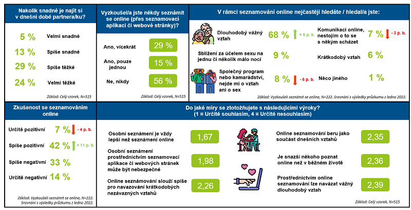 S tvrzením, že prostřednictvím seznamovací aplikace či webových stránek lze navázat vážný dlouhodobý vztah, souhlasí 55 % dotázaných. Nejskeptičtěji se k tomuto výroku staví dotázaní starší 55 let a respondenti s nižším vzděláním. O tom, že seznamovací aplikace či webové stránky slouží spíše pro navazování krátkodobých nezávazných vztahů, je přesvědčeno 66 % dotázaných. A zatímco v Praze a ve Středočeském kraji se s tímto tvrzením ztotožňuje 72 % respondentů, na Moravě se jedná pouze o 58 %.