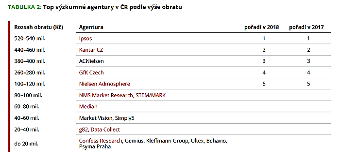 Pořadí výzkumných agentur na prvních pěti místech je identické jako v roce předešlém. Ve vedení je pět mezinárodních agentur, které tvoří 62 % celkového obratu. Obratově nejsilnější tak zůstávají Ipsos, Kantar CZ a AC Nielsen.