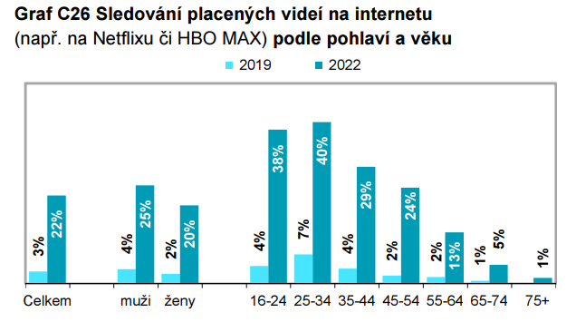 V mladších skupinách 16-24 a 25-34 let dosahuje podíl sledování placených internetových videí 40 %. Přesto Česko zůstává pod průměrem Evropské unie, který představuje téměř dvojnásobek na 42 %.