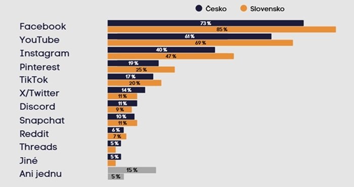 Nejvíce uživatelů v obou zemích používá nebo má z minulosti zkušenost se sociálními médii Facebook, Youtube a Instagram. I otázky související s přítomností na konkrétních sociálních sítích ukazují, že Slováci jsou v digitální komunikaci celkově aktivnější. Facebook navštěvuje 85 % oproti 73 % Čechů, u YouTube je tento poměr 69 % ku 61 % a u Instagramu 47 % ku 40 %. Na službě TikTok je aktivních 20 % Slováků oproti 17 % Čechům, u Pinterestu je poměr 25 % ku 19 %. Pouze u některých platforem mají Češi mírně vyšší zastoupení uživatelů – například síť X využívá 14 % Čechů oproti 11 % Slováků a Discord 11 % Čechů oproti 9 % Slováků.