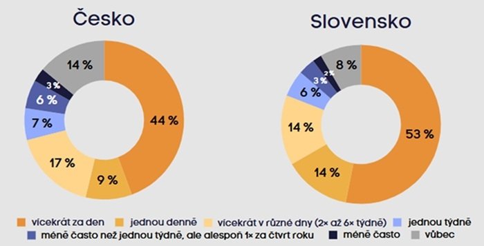Sociální sítě jako jsou například Facebook, Instagram, X/Twitter či TikTok využívá alespoň jednou denně 49 % respondentů v Česku a 65 % na Slovensku. Vícekrát denně je využívá 37 % lidí v Česku a 49 % na Slovensku. Výrazně více Čechů (24 % oproti 12 % Slováků) uvedlo, že tyto aplikace nepoužívá vůbec.