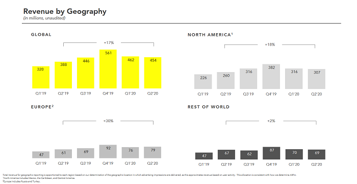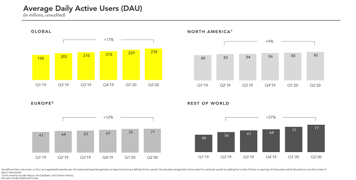 Zatímco v Severní Americe vyrostl počet denních uživatelů Snapchatu od března do června o 9 %, v Evropě o 12 %, tak ve zbytku světa o 37 %.