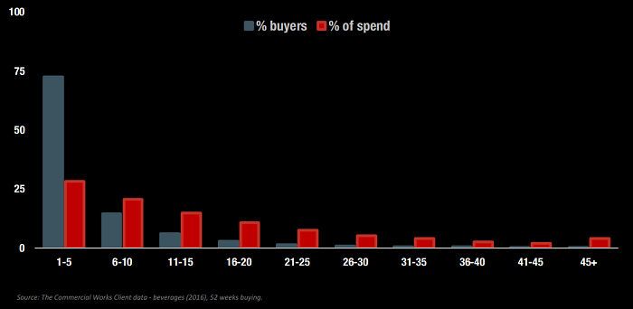 Zákazníci, kteří kupují často a kterých je celkově mnohem méně, přinášejí ale více výnosů. 20 % zákazníků přineslo podle Snijderse jedné nejmenované značce 60 % výnosů. Je tak snadné zaměřit se na tuto skupinu zákazníků. Přestože v levé části pomyslného schématu se skrývá jistý potenciál, marketingoví manažeři se stále více koncentrují na vysoce loajální kupující, tedy na pravou stranu schématu. „Nemá smysl investovat všechny peníze na cílení skupiny lidí, která zůstane početně nízká. Neměli bychom se soustředit převážně jen na pravou stranu,“ říká Snijders. Cílem je tak dosáhnout vyvážené komunikace k oběma zákaznickým typům: v levé části jsou zákazníci, kteří kupují jen občas, ale na které je třeba se při komunikaci zaměřit, na druhou stranu je u nich malá pravděpodobnost konverze. V pravé části jsou častí zákazníci, ke kterým ale není nutné komunikovat tak často. Vyznačují se ale vysokou pravděpodobností konverze.