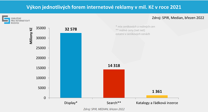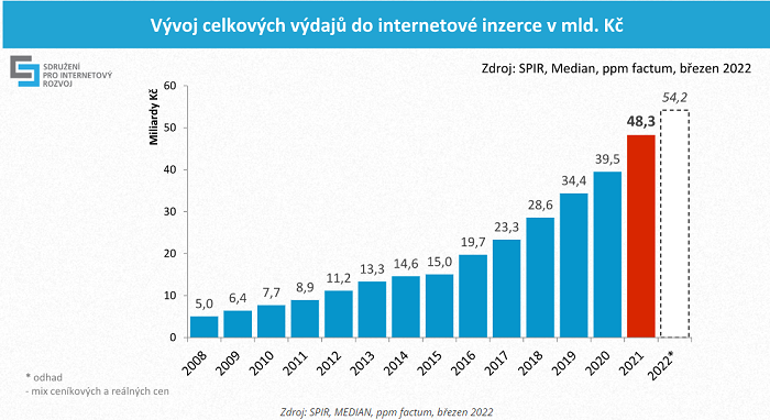 Výdaje do online reklamy na českém trhu loni dosáhly 48 miliard korun. Jedná se o dosud nejvyšší investice, oproti roku 2020 jde o 22% nárůst, na kterém se v absolutních hodnotách nejvíce podílela display reklama (+21 %) a reklama ve vyhledávání (+27 %). Údaje pocházejí z výzkumu inzertních výkonů internetové reklamy, který pro Sdružení pro internetový rozvoj (SPIR) realizuje agentura Median.