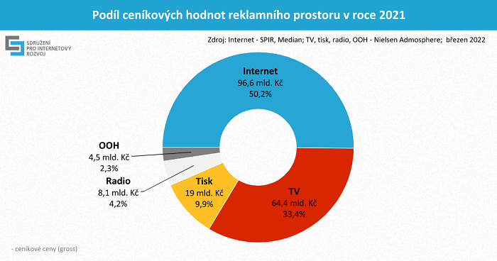 Pro porovnání velikosti inzerce za celé mediatypy byly použity údaje z monitoringu reklamních investic Nielsen Admosphere. Na online reklamu, přepočtenou pro účely srovnání s ostatními mediatypy do ceníkových cen, připadá podle SPIR 50,2% podíl (96,6 mld. Kč). Následuje televize s 64,4 mld. Kč (podíl 33,4 %).