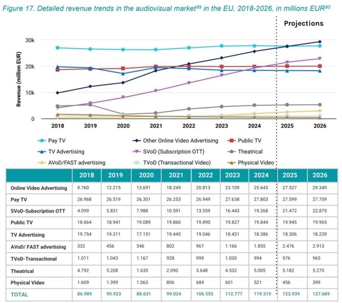 Podíl vysílatelů na tržbách klesl z 75 % v roce 2018 na očekávaných 53 % v roce 2025, zatímco SVoD (příjmy z předplatného videa) má do stejného roku vzrůst na 17 %. Příjmy kin po pandemii oživily, ale stále nedosáhly předcovidových hodnot.