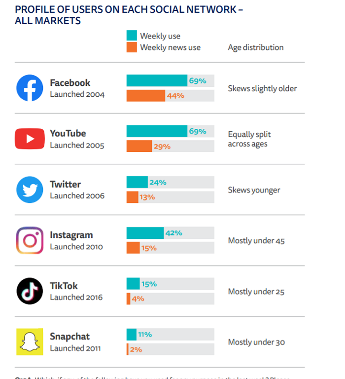 Nedávno zveřejněná aktualizovaná studie Digital News Report od Reuters Institute si všímá rovněž role sociálních sítí jako zdroje pro šíření a konzumaci zpráv. Vyplývá z ní, že nejvíce navštěvovanou platformou zůstává Facebook, který je rozšířený mezi velkou škálu uživatelů. Mezi mladými lidmi se stále více rozvíjí TikTok a také Snapchat. Zatímco pro uživatele Twitteru je hlavní motivací pro návštěvu nejnovější zpravodajství, Facebook je spíš nahodilým zdrojem zpráv. Jeho uživatelé tuto sociální síť totiž většinou navštěvují s jiným cílem. Platformy, jako jsou Instagram, Tik Tok, Snapchat a Youtube, jsou primárně zdrojem zábavy, konstatuje studie.