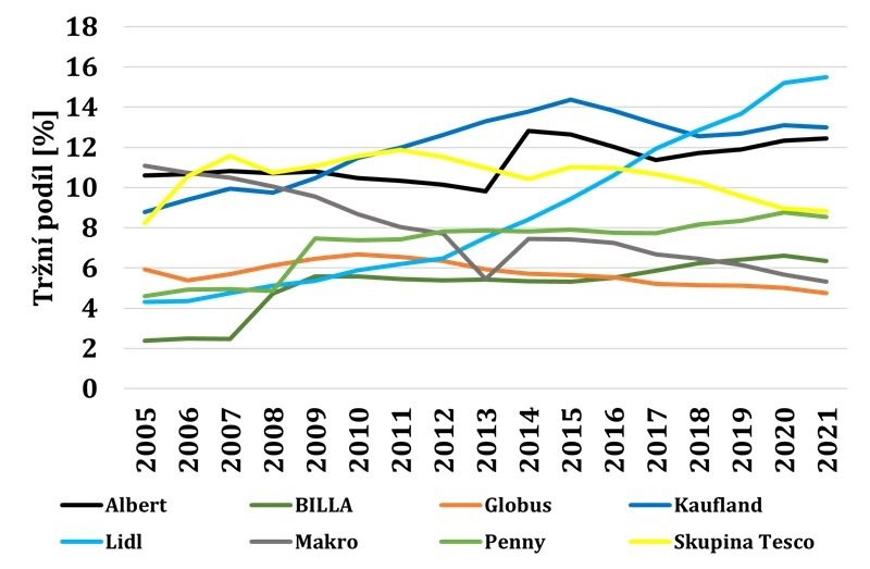 Největšího nárůstu podílu na maloobchodním trhu dosáhl od roku 2005 za šestnáct let řetězec Lidl (skupina Schwarz-Gruppe). Jeho podíl vzrostl z 4,3 % v roce 2005 na téměř 15,5 % v roce 2021. Ukazuje to studie od ekonomů z Mendelovy univerzity v Brně, která se zaměřila na maloobchodní trh v České republice a která vznikala ve spolupráci s Úřadem na ochranu hospodářské soutěže (ÚOHS).