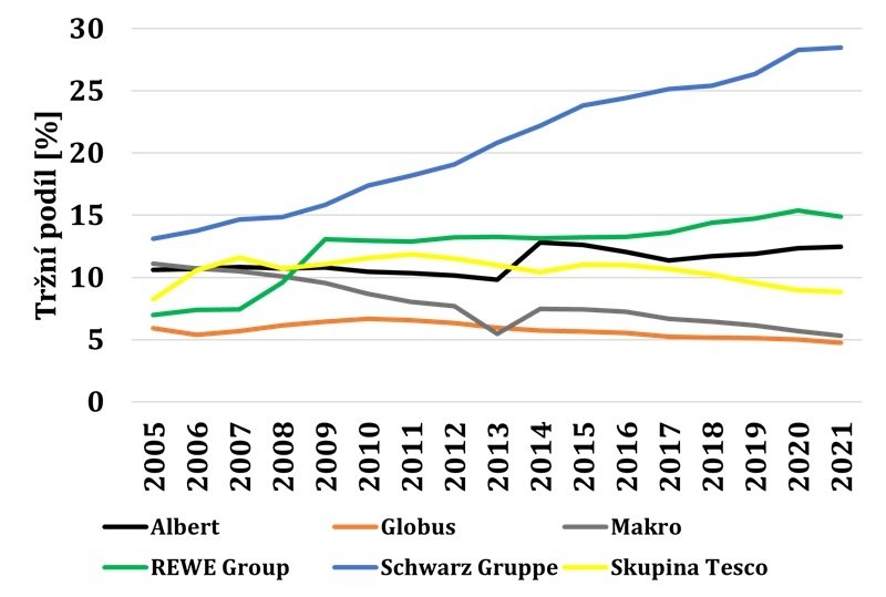 Ekonomové Michal Mádr a Radek Náplava z Provozně ekonomické fakulty Mendelovy univerzity sledovali a analyzovali vývoj maloobchodního prodeje v nespecializovaných prodejnách v období let 2005 až 2021, v některých oblastech i v roce 2022. Konkrétně se zpracovatelé zaměřili na vývoj tržních podílů šesti největších firem, které zahrnují devět největších obchodníků: