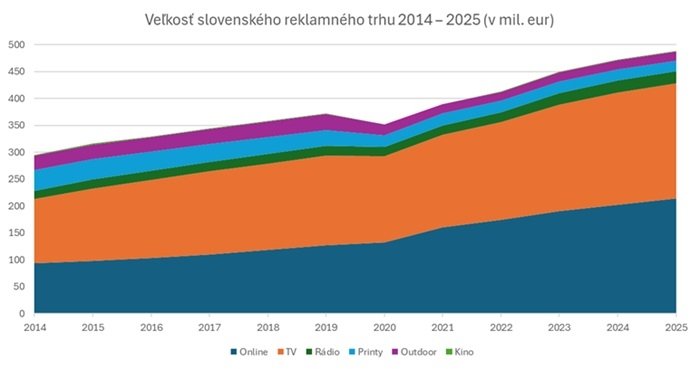 Ak sa pozrieme na vývoj reklamných investícií na Slovensku z dlhodobého hľadiska, za posledných 10 rokov nastalo niekoľko výrazných posunov. Celkovo sa reklamný trh zväčšil o 54%: z 316 milióna eur v roku 2015 na bezmála 489 milióna prognózovaných na rok 2025. Ťahúňom je online, keď za dekádu narástol o 117% z 99 na 214 miliónov eur. Televízia si tiež výrazne polepšila – o 60% zo 134 na 214 miliónov eur. Trh nepraje printom, ktorým za dekádu klesli tržby z reklamy o 48% (z 38 na necelých 20 miliónov eur), ani outdooru s 38-percentným poklesom (z 27 na 17 mil.). Rádio bolo pred desaťročím až za nimi so 17 miliónmi eur, no nárastom o 31% na 22 miliónov ich oba predbieha. Najmenšie kino oscilovalo medzi 1,5-1,7 milióna eur, prepadlo sa však kvôli covidu a návrat na pôvodné hodnoty trvá už zopár rokov.