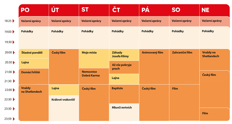 Druhá půlka týdne nabídne ve večerním slotu od 20:00 hodin Záhady Josefa Klímy, od druhé poloviny srpna pak bude v kriminální tématice pokračovat seriál Až vše pokryje prach a Baptiste. Pátek bude patřit celé rodině v podobě animovaných filmů. Sobotní večery jsou vyhrazeny filmům.