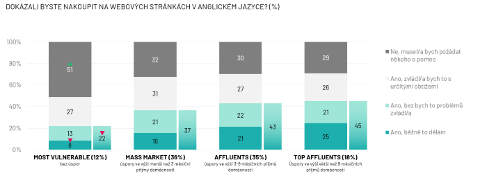 Schopnost nakupovat na webech v anglickém jazyce je vyšší u spotřebitelů s vyšším vzděláním, s vyšším osobním příjmem a vyšším příjmem domácnosti, spotřebitelů bydlících v Praze a u mladších spotřebitelů. Nejnižší je u finančně nejvíce ohrožených domácností, tj. u domácnostech s výrazně nižšími příjmy a nižším vzděláním ve srovnání s ostatními domácnostmi.
