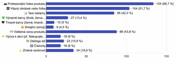 Pozornost uživatelů pak v online reklamě nejvíce přitáhne profesionální fotografie produktu (66,7 %), vtipná fotografie ve spojení s produktem a viditelná cena produktu.