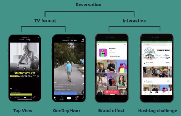 Reklama se na TikToku prodává dvojím způsobem: aukčně a rezervačně. Ve druhém z uvedených případů je třeba využít agenturu, nebo kontaktovat přímo TikTok a vybrat si z dostupných formátů, popsala Claudia Mónica Gutiérrez, social media manager World of Online. Aukční prodej obnáší infeedové reklamy, které se nakupují na základě zvoleného rozpočtu. Cílení je možné nastavit na zásah, traffic, stažení aplikace, video přehrání nebo konverze. TikTok v nedávné době přišel s interaktivními prvky v reklamách. K nim patří například formáty: