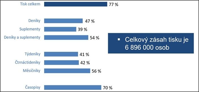 Deníky a jejich přílohy čte nadpoloviční většina, konkrétně 54 % z celé populace. Časopisy čte 70 % obyvatel z uvedené populační skupiny.