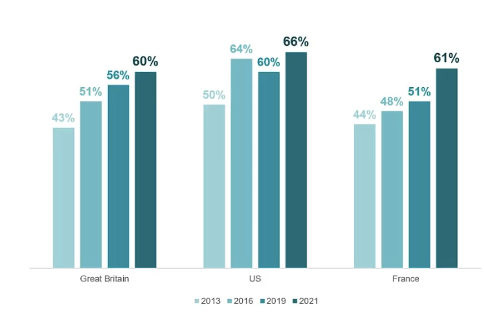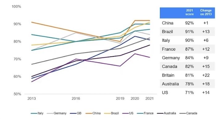 I nadále se spotřebitelé čím dál více zaobírají udržitelností. Klimatická změna je po celém světě klíčovým tématem. Většina spotřebitelů napříč trhy se domnívá, že je potřeba urychleně změnit naše dosavadní návyky, jinak budeme čelit environmentální katastrofě. Od roku 2013 podíl takto smýšlejících v populaci narostl. V Číně je dnes toho názoru 92 % lidí (+1 pb. oproti roku 2013), v Německu 84 % (+9 pb.), ve Velké Británii 81 % (+22 pb.) a v USA 71 % (+ 14 pb.). Zatímco globální průměr tvoří 85 %, ve středoevropském regionu je to jen 79 %. Od firem lidé nyní také více vyžadují, aby se snažily snižovat svou ekologickou stopu, než aby řádně platily daně.