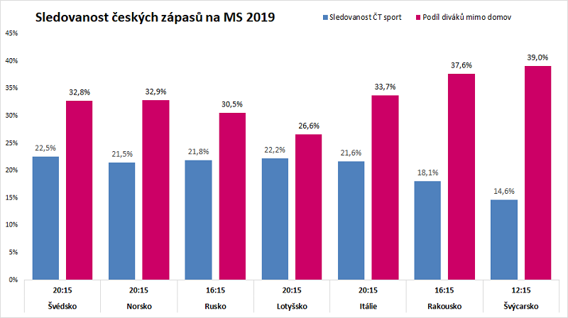 Data ukazují, že zápasy základní skupiny české reprezentace sledovala mimo domov v průměru třetina diváků. Jedná se o mírně vyšší číslo, než v případě předchozích šampionátů. Například před dvěma lety byla sledovanost mimo domov okolo 20 % všech českých hokejových diváků.