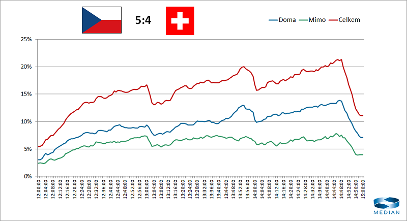 Diváci mají rádi drama, potvrzuje se to i na vývoji sledovanosti zápasu se Švýcary, který byl velmi bohatý na góly i vyhrocené situace. Sledovanost zde mimo útlum v přestávkách rostla v průběhu celého zápasu, a i přes nepříznivý vysílací čas (po poledni) dosahovala místy přes 20 % všech diváků u televizních obrazovek.