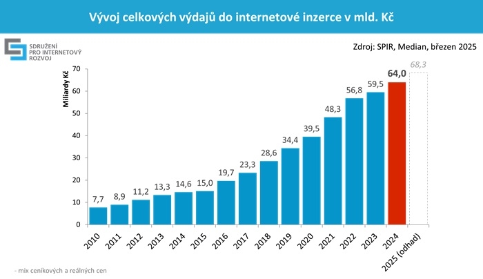 Zadavatelé v roce 2024 investovali do internetové reklamy rekordních 64 miliard korun v kombinaci ceníkových a čistých cen. Jde o historicky nejvyšší částku, která znamená meziroční nárůst o 7,5 %. Nejvíce k tomuto výsledku přispěla display reklama (+9,5 %) a programatický nákup display reklamy (+11 %), mírný růst zaznamenala i reklama ve vyhledávání (+3 %). Data zveřejnilo profesní sdružení SPIR.