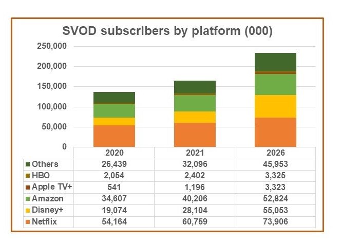 Prvně jmenovaný má v období následujících pěti let růst o více než 20 milionů a dosáhnout 74 milionů předplatitelů. Disney+ je za stejné období předpovídán růst na 55 milionů. Tím předběhne i Amazon Prime Video, který by se měl podle prognózy dostat na 53 mil. předplatitelů.