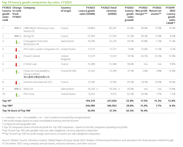 Ve fiskálním roce 2022 dosáhlo 100 největších světových společností zabývajících se výrobou a prodejem luxusního zboží celkových tržeb ve výši 347 miliard dolarů, tedy o 42 miliard dolarů více než v předchozím roce, čímž tak pokořilo hodnoty před pandemií. Tento prudký nárůst signalizuje, že se celý sektor s luxusním zbožím vrací zpět na výsluní. Minimální hranice tržeb pro vstup na žebříček TOP 100 byly příjmy ve výši 284 milionů dolarů.