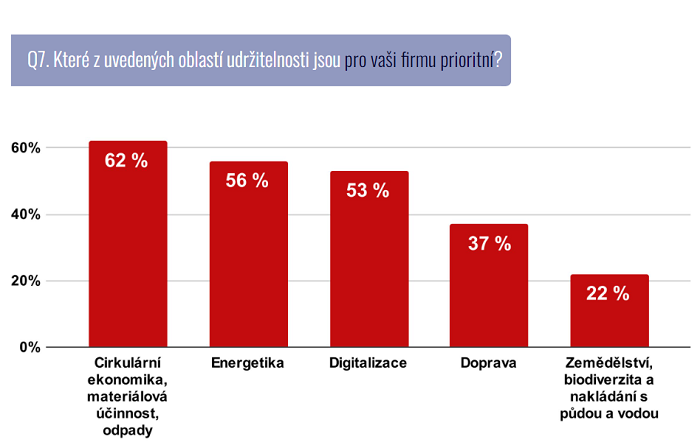 Firmy aktivní v udržitelnosti považují za prioritní oblast cirkulární ekonomiku, materiálovou účinnost a odpady a je pro ně dokonce zajímavější než energetika. Naopak mezi překážky zavádění udržitelnosti do praxe patří nedostatek kapacit či kompetencí, finančních zdrojů nebo nejasná legislativní opatření. U mikro firem do 10 zaměstnanců uvádí jako hlavní problém nedostatečné financování celých 49 % respondentů.