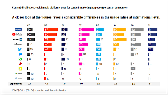 Pro šíření obsahu se již standardně využívají sociální sítě. Jejich rozložení se však v každé zemi liší. V šesti z osmi zemích je neužívanější Facebook, zato v Rakousku je na prvním místě YouTube a v Dánsku LinkedIn. V Česku se do obsahové strategie po Facebooku nejčastěji zapojuje také YouTube, Instagram, LinkedIn a Twitter. V jiných zemích se však hojně využívají i chatovací aplikace typu WhatsApp nebo Messenger.