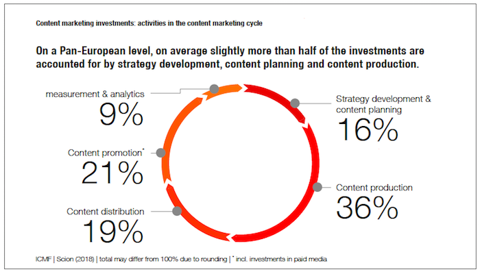 Co se týče rozložení investic, největší podíl je věnován tvorbě obsahu (36 %). Pětina rozpočtu putuje na jeho následnou podporu (21 %) a distribuci (19 %). Na strategii a plánování je alokováno 16 % a na následné měření a analytiku 9 %.