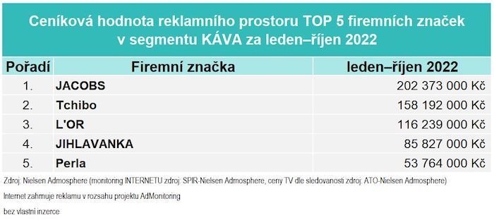 Ze značek kávy na trhu investovala do reklamy v období od ledna do října letošního roku nejvíce značka Jacobs, která do ní vložila přes 202 mil. korun. Na druhém místě se umístilo Tchibo se 158 mil. korun a na třetím L’Or se 116 mil. korun. Vyplývá to z monitoringu reklamy Ad Intel, jež sleduje ceníkové ceny inzerce.
