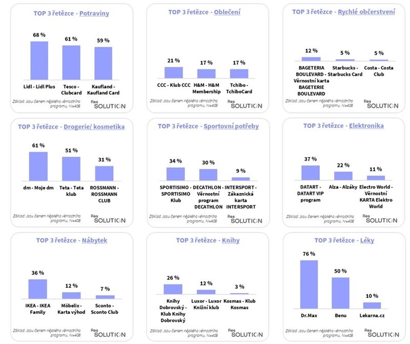 Nejčastěji se užívají věrnostní programy u prodejců potravin (98 %), prodejců léků (88 %) a prodejců drogerie a kosmetiky (80 %). Uvedeny jsou podíly z těch, kteří jsou členem nějakého věrnostního programu.