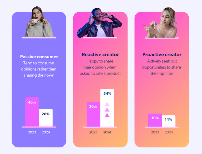 Mezi nakupujícími výrazně narostl počet těch, kteří jsou ochotni sdílet svůj názor, pokud jsou k tomu vyzváni. Letos jich je 54 %, oproti tomu loni jich bylo jen 36 %. Každý druhý zákazník je tak ochoten tvořit obsah pro značku, čehož by měly firmy využít.
