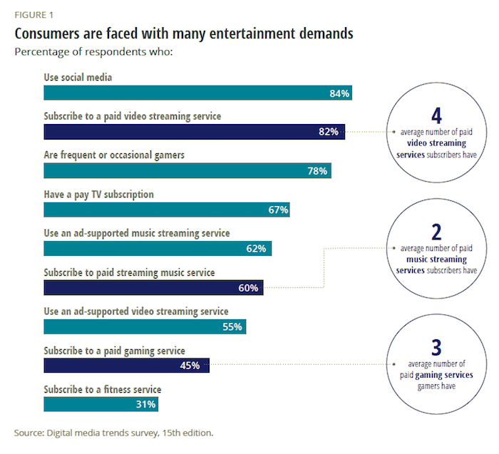 Podle studie, jež proběhla na více než 2000 respondentech v USA, se nejvíce lidí nyní baví na sociálních sítích (84 %). Alespoň jednu streamovací službu si předplácí 82 % dotázaných a více než tři čtvrtiny si často nebo občas zahrají hru (78 %).