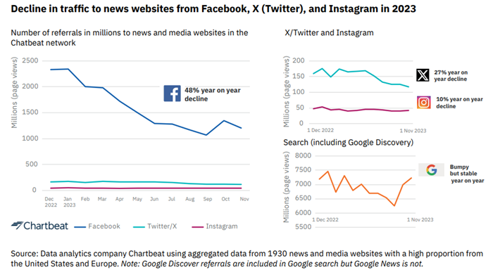 Další snížení přístupů ze sociálních sítí, zejména z Facebooku a X, očekávají pro letošní rok vydavatelé tisku a provozovatelé zpravodajských online médií. Uvádí to studie Journalism, Media and Technology Trends and Predictions 2024 od Reuters Insitute. Naznačuje rovněž, že kvůli slábnoucí schopnosti sociálních sítí přivádět uživatele na webové stránky nastává konec „modelu odkazování“ (referral model).