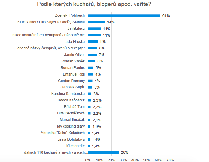 V otázce konkrétních oblíbenců žebříček popularity ovládl Zdeněk Pohlreich, kterého spontánně zmínilo 61 % lidí, s velkým odstupem ho následuje duo Kluci v akci (14 %) a Jiří Babica (11 %) s kuchařem Láďou Hruškou (9 %).
