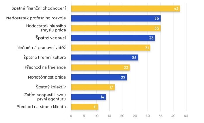 Nejčastější důvody, které lidé uvádějí při odchodu z agentury, jsou podle výsledků průzkumu špatné finanční ohodnocení a nedostatek profesního rozvoje (43 %) či postrádání hlubšího smyslu práce (35 %). V těsném závěsu pak dotazovaní zmiňovali nespokojenost se svým vedoucím a neúměrnou pracovní zátěž. Špatné finanční ohodnocení stojí na prvním místě jak u zaměstnanců, tak u živnostníků. Další důvody se u obou typů úvazků už ale liší. Zaměstnanci častěji odcházejí kvůli špatným vedoucím. U živnostníků hraje větší roli profesní rozvoj a hlubší smysl práce.