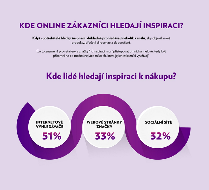 Nejčastěji se inspirujeme pomocí vyhledávačů (54,3 %) jako Google a Seznam. Náš trh se tak liší od ostatních dotazovaných zemí (s výjimkou Nizozemska), kde vyhledávače zaujímají až druhé místo a na prvním je Amazon. Druhé místo v inspiraci obsadily sociální sítě. Těmi se nechávají ovlivnit zejména mladí lidé do 24 let (52,7 %), u věkové kategorie 25 až 34 let je to pak 44,8 % dotázaných. V kamenných prodejnách se inspiruje 20 % spotřebitelů, častěji mladších. Reklamy (TV, e-maily atp.) slouží k inspiraci 13,5 % dotázaných.