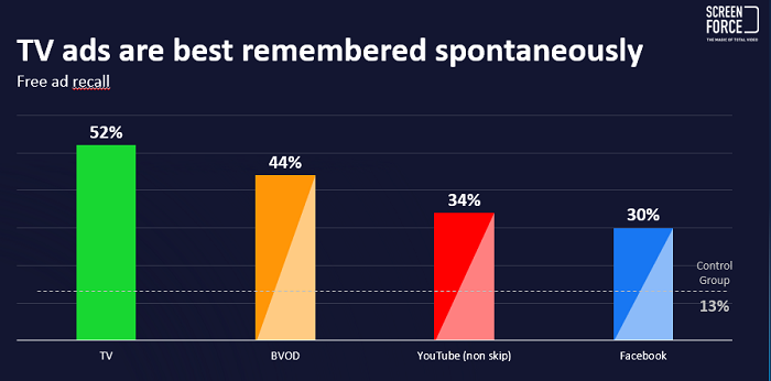 Reklama sledovaná na televizní obrazovce má ve srovnání s jinými typy platforem, určených pro sledování videoobsahu, nejlepší výsledky ve spontánní a podpořené znalosti. Zjistila to studie Track the Success od Screenforce, která sledovala faktory ovlivňující příjem reklamních sdělení na různých platformách (TV, BVOD, YouTube a Facebook) v Německu, Švýcarsku a v Rakousku. Výsledky studie prezentovali v Praze na konferenci Asociace komerčních televizí (AKTV) Daniel Reiner a Stefan Schönherr.