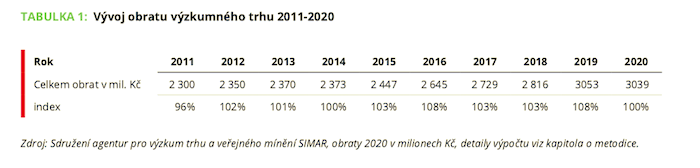 Obrat českého výzkumného trhu překročil i v loňském pandemickém roce třímiliardovou hranici. Jeho velikost dosahuje podle odhadu Sdružení agentur pro výzkum trhu a veřejného mínění (SIMAR) 3,039 mld. korun. Jedná se jen o mírný pokles oproti předcházejícímu roku, kdy dosáhl 3,053 mld. korun. Vyplývá to z výroční zprávy za loňský rok, kterou SIMAR publikoval u příležitosti Mezinárodního dne výzkumu.